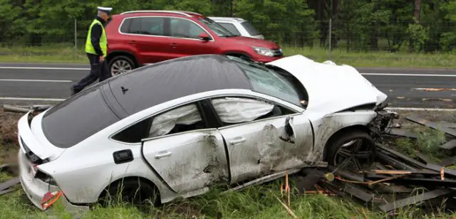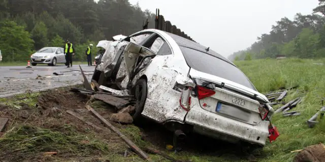 Policjanci, którzy przyjechali na miejsce zdarzenia, zastali leżące za pasem jezdni luksusowe audi RS7 i kilkadziesiąt metrów ściętych barierek ochronnych. Audi zostało dosłownie rozbite. Kierowca i pasażer sami wysiedli z samochodu. Zostali jednak zabrani przez pogotowie ratunkowe do szpitala. Uskarżali się na bóle.