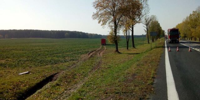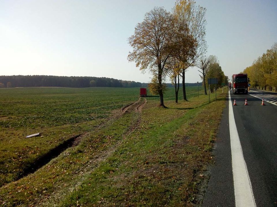 Opel po zderzeniu został na jezdni, a ciężarówka wypadła z drogi i pojechała jeszcze ponad 100 metrów w pole i dopiero wtedy zatrzymała się.
