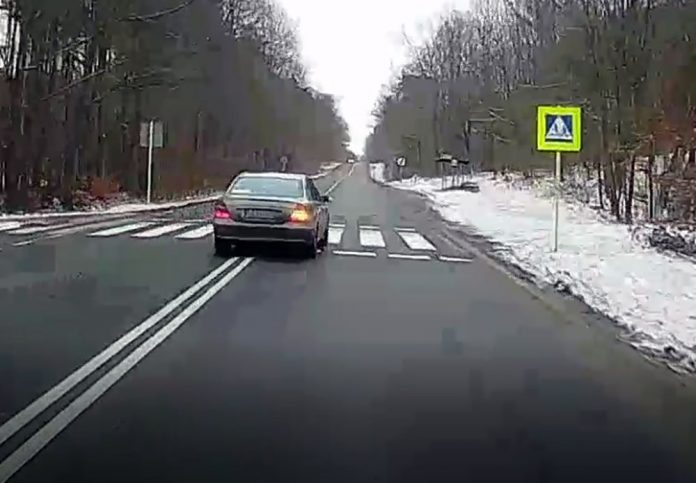 Kierowca mercedes zbagatelizował bezpieczeństwo i na drodze z Wilkanowa wyprzedził na przejściu dla pieszych. To niebezpieczny i zabroniony manewr.