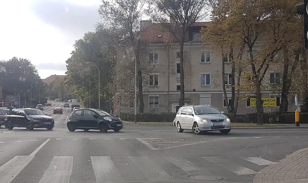 Kierowca toyoty jechał ul. Wyspiańskiego w kierunku basenu. Zapaliło się zielone świtało dla skręcających w prawo w ul. Staszica. Jadący ul. Wyspiańskiego mogli jechać w ul. Staszica. Tak też było. Wtedy kierujący toyotą wjechał na skrzyżowanie na czerwonym świetle i zawrócił skręcając w ul. Wyspiańskiego w kierunku wiaduktu.