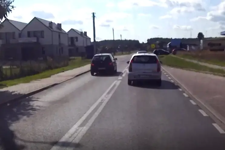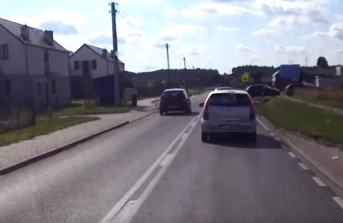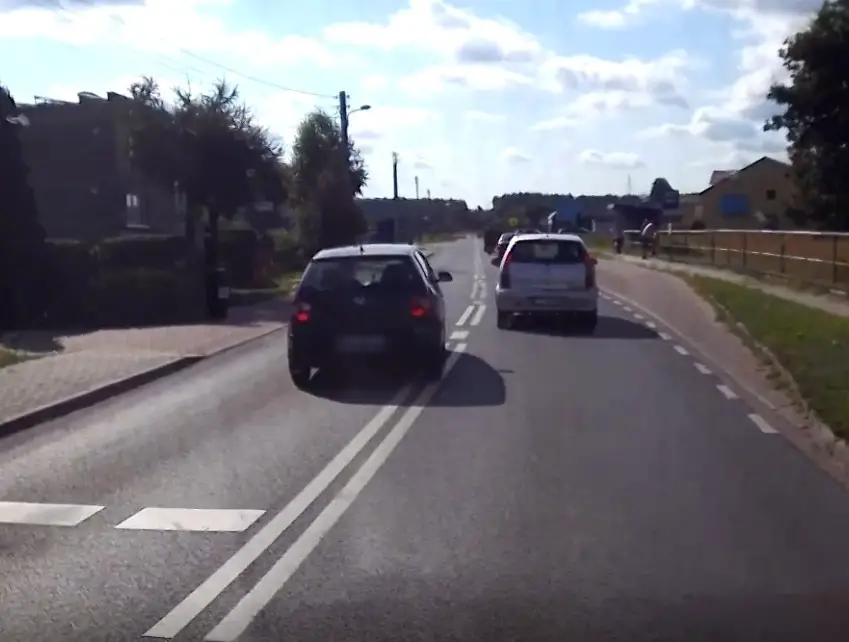 Widać, że kierowca volkswagena polo za nic ma przepisy oraz bezpieczeństwo. Na drodze w Płotach wyprzedził samochody nie tylko na podwójnej linii ciągłej, ale również na przejściu dla pieszych.