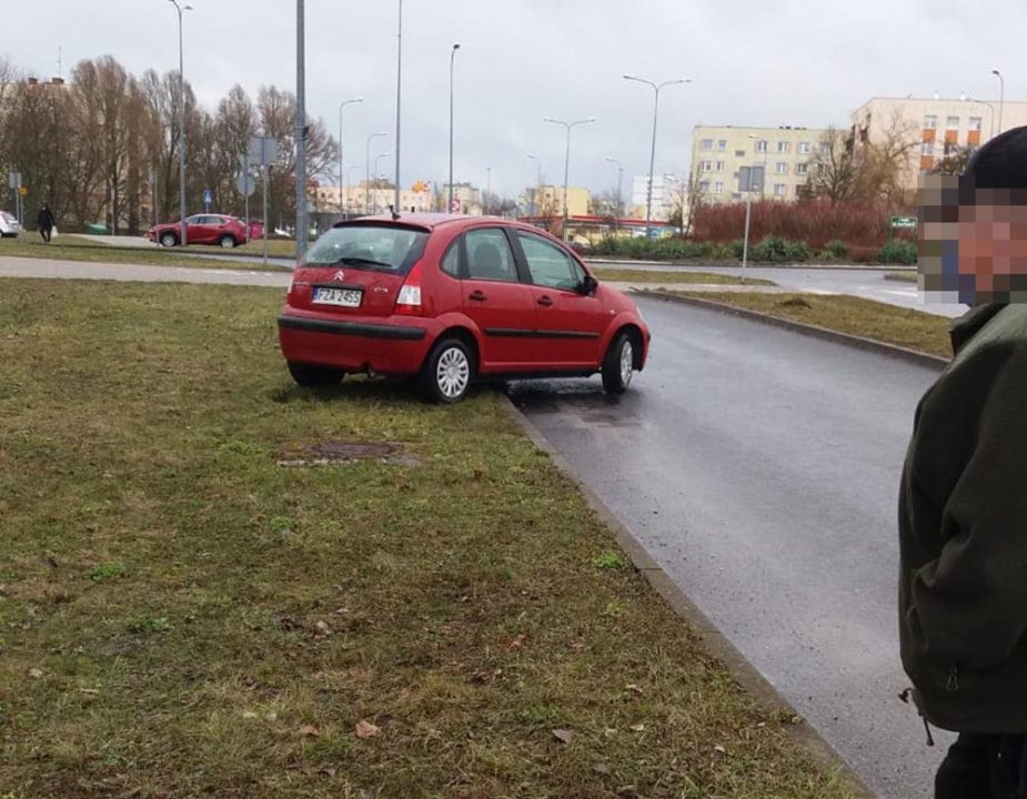 Citroen wypadł z drogi uderzając kołami w krawężnik. Siała uderzenia była na tyle duża, że jedno z kół zostało oderwane do auta.
