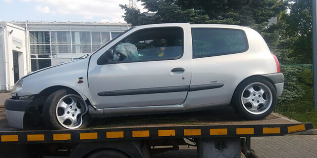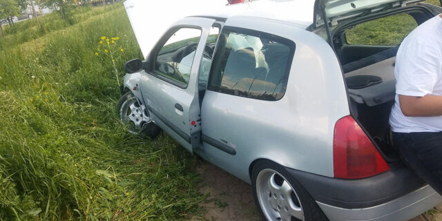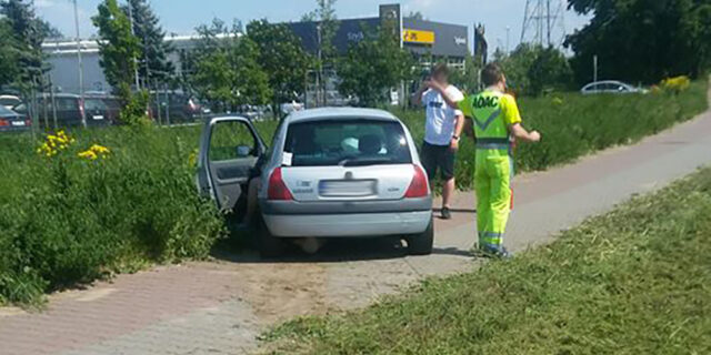 Renault wypadło z jezdni i przejechało kilkadziesiąt metrów na drugą stronę w kierunku ul. Walczaka. Po drodze renault uderzając w krawężniki między innymi pourywało koła.