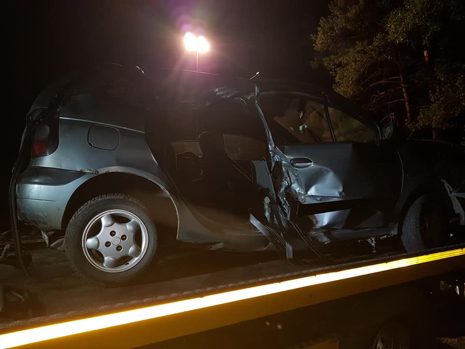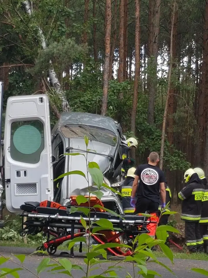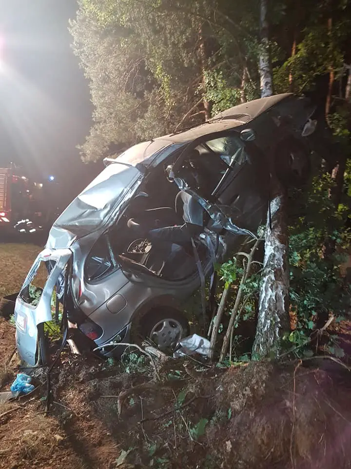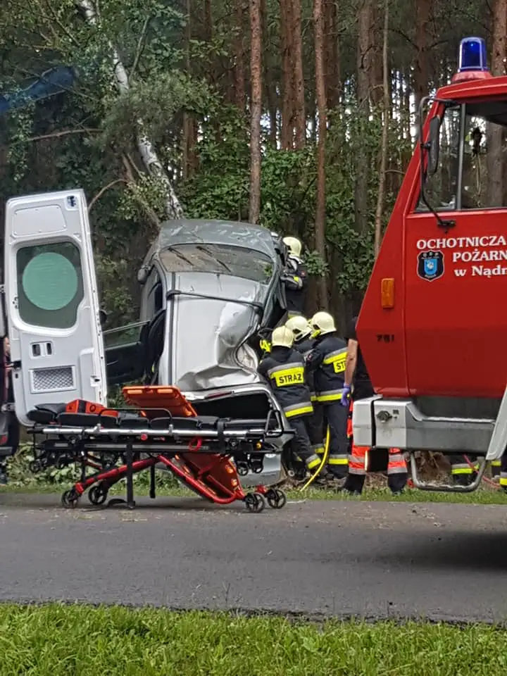 Kierujący renault zjechał z drogi i z dużą szybkością uderzył w drzewo. Samochód zawinął się na pniu. Na miejsce przyjechały służby ratunkowe. Strażacy zawodowi oraz OSP Nądnia wycinali zakleszczonego w rozbitym aucie pasażera. To była bardzo trudna akcja.
