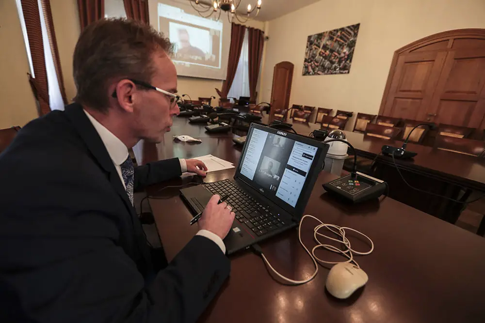 W piątek, 24 kwietnia, pierwszy raz w historii radni miasta Zielona Góra spotkają się nie na sali w ratuszu, ale przed monitorami w swoich domach. To wszystko z powodu pandemii koronawirusa. Dla bezpieczeństwa sesja odbędzie się online. W środę odbyła się próba do piątkowej sesji. Radni połączyli się online. Na sali był przewodniczący rady miasta Piotr Barczak oraz radny Paweł Wysocki.