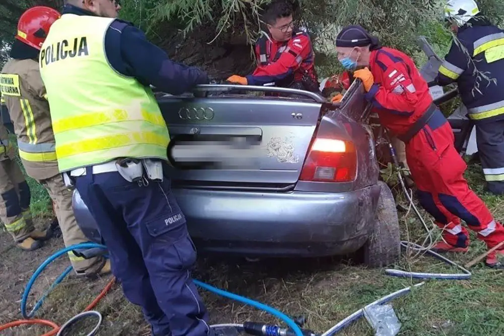 Na miejsce wypadku dojechały służby ratunkowe. Siła uderzenia audi w drzewo była potężna. Z samochodu niewiele zostało.