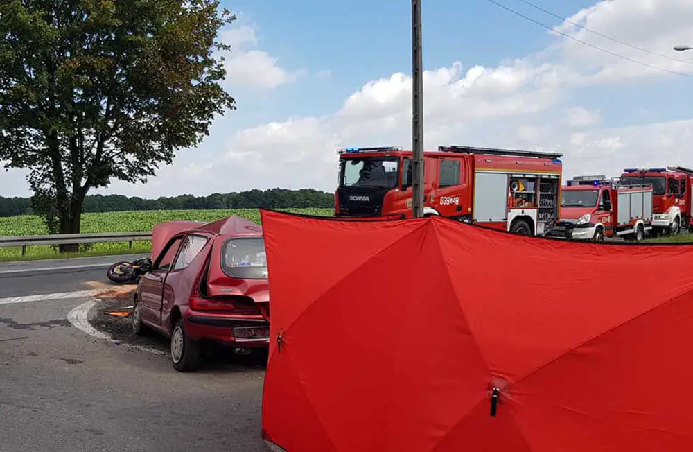 Kierująca fiatem seicento 47-letnia kobieta wjechała z impetem na skrzyżowanie ul. Gliwickiej z drogą krajowa nr 49 w Boniowcach. Tam staranowała prawidłowo jadącego motocyklistę. Motocyklista został staranowany i potem przyciśnięty do barierki ochronnej przez samochód. Na miejsc wypadku przyjechały służby ratunkowe. Strażacy OSP Świętoszowice uwolnili ciężko rannego motocyklistę spod samochodu. 42-latek był długo reanimowany. Niestety jego obrażenia były poważne. Motocyklista zmarł na miejscu. Z mocno rozbitego fiata została również uwolniona kierująca. Ranna 47-latka została karetką przewieziona do szpitala.