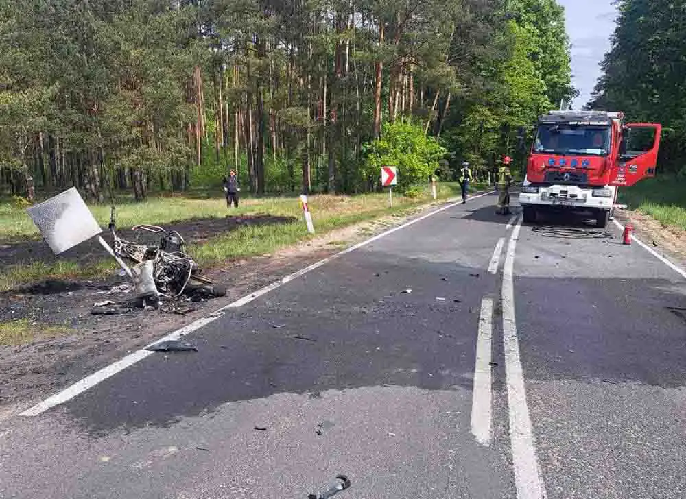 Do tragicznego wypadku doszło w środę, 7 maja, na drodze w Nowym Polichnie pod Gorzowem. Motocyklista zderzył się z samochodem osobowym. Motocykl spłonął. Mimo długiej walki o żucie nie udało się. Motocyklista zginął na miejscu wypadku