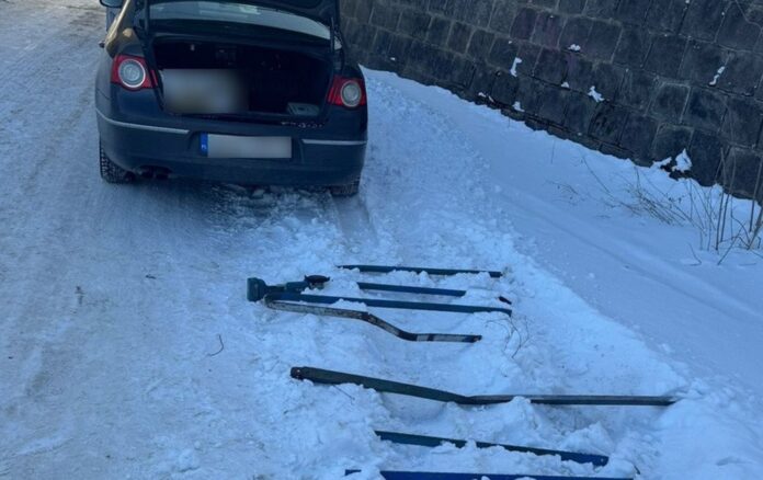 W czwartek (22.01.2026) policjant z Wydziału Zabezpieczenia Miasta Komendy Miejskiej Policji w Olsztynie pełnił służbę ze strażnikami leśnymi z Nadleśnictwa Wipsowo. Około godz. 11:30 w okolicy miejscowości Wilimy pod wiaduktem kolejowym funkcjonariusze zauważyli mężczyznę, którego zachowanie wzbudziło ich podejrzenia. Podjęli wobec niego interwencję. Niedaleko miejsca, w którym stał mężczyzna funkcjonariusze zobaczyli uszkodzoną barierkę ochronną oraz leżące obok niej pocięte metalowe elementy. W śniegu leżała również szlifierka, która mogła służyć do cięcia metalu. Obok nasypu stał zaparkowany volkswagen. Mężczyzna początkowo twierdził, że nie wie do kogo należą ujawnione przedmioty oraz auto. Nie potrafił jednak wytłumaczyć, co robi w tym miejscu i jak się w nim znalazł. Szybko jednak okazało się, że volkswagen należy do niego, a on sam został złapany na gorącym uczynku kradzieży infrastruktury drogowej. W bagażniku samochodu funkcjonariusze znaleźli pocięte już metalowe elementy barierki ochronnej. Ujawnione przedmioty zostały zabezpieczone, a 38-latek został zatrzymany i przewieziony do Komisariatu Policji w Biskupcu. Policjanci ustalili, że wartość strat w tym przypadku wynosi kilka tysięcy. Dokładna kwota jest wciąż ustalana. 37-latek usłyszał już zarzut kradzieży. Przyznał się do zarzucanego mu czynu. Za popełnione przestępstwo odpowie przed sądem. Grozi mu kara nawet do 5 lat więzienia.