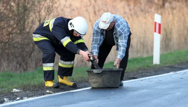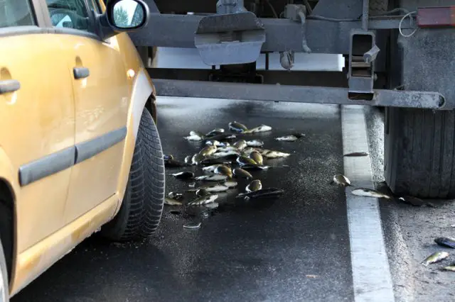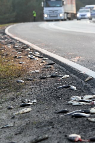Ciężarówka zatrzymała się na poboczu. Po chwili w jej tył uderzyła kobieta kierująca citroenem c3. – Wpadłam w poślizg na rozsypanych na jezdni rybach – powiedziała nam kierująca. Po chwili okazało się, że kobieta jechała z dwojgiem pasażerów na… ryby. – To sobie połowiliśmy – powiedziała z u śmiechem.