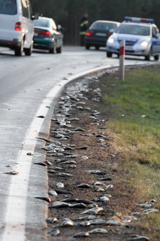 W sobotę około godz. 17.00 ma odcinku za Świdnicą z ciężarówki na jezdnię wypadły setki młodych karpi. Na rybach wpadła w poślizg kierująca citroenem c3 i uderzyła w tył ciężarówki. – Aż trudno uwierzyć, że właśnie jechaliśmy na… ryby – mówiła nam kobieta kierująca citroenem.