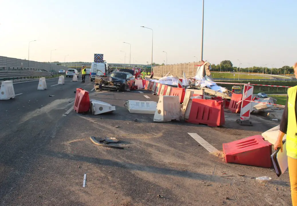 Bmw po zderzeniu z volvo uderzyło w separatory jazdy i tyłem zderzyło się z peugeotem jadącym środkowym pasem ruchu.