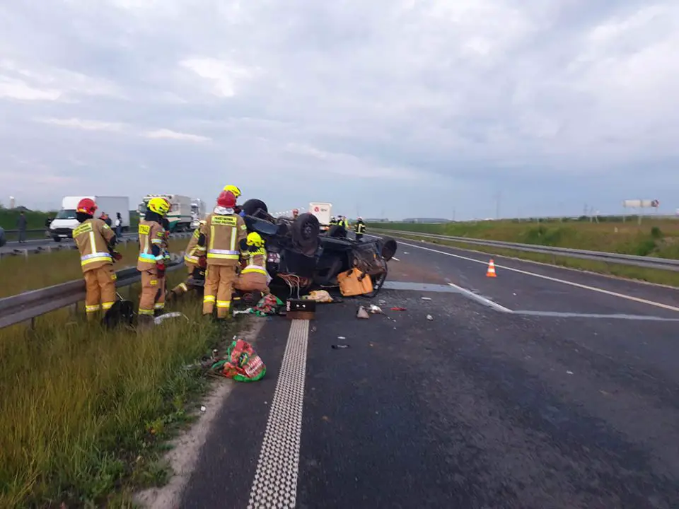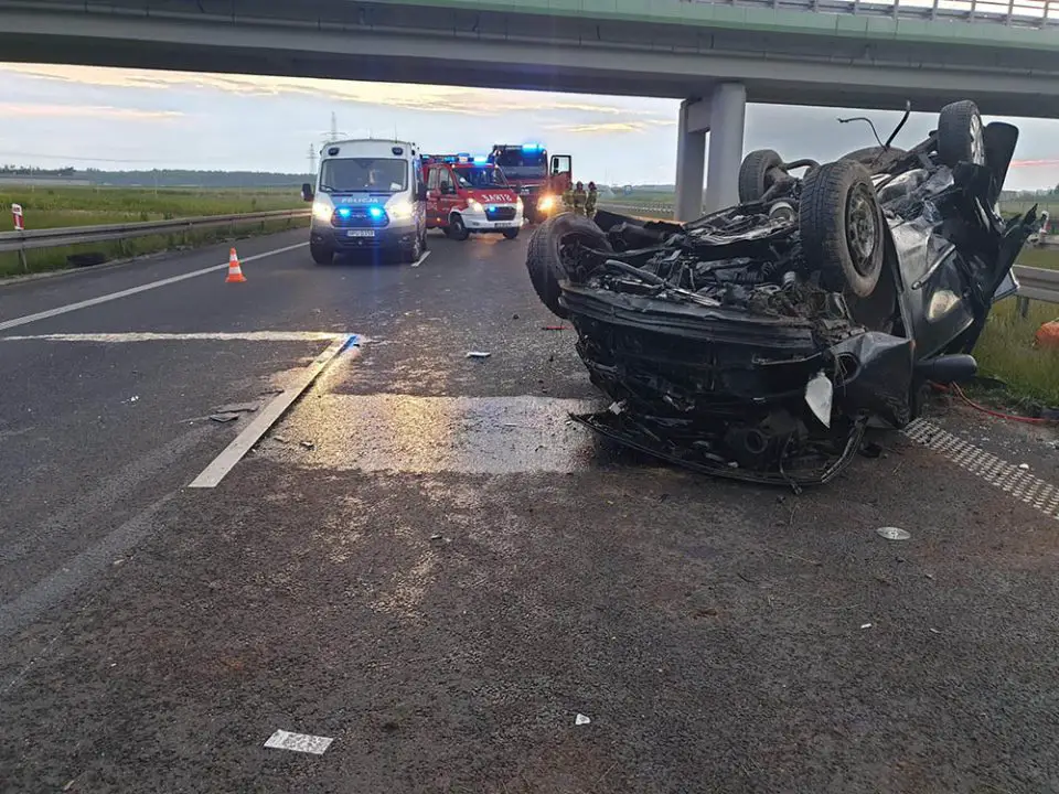 Rozpędzony samochód osobowy dachował na ekspresowej S5. Podczas dachowania z auta wypadł pasażer.
