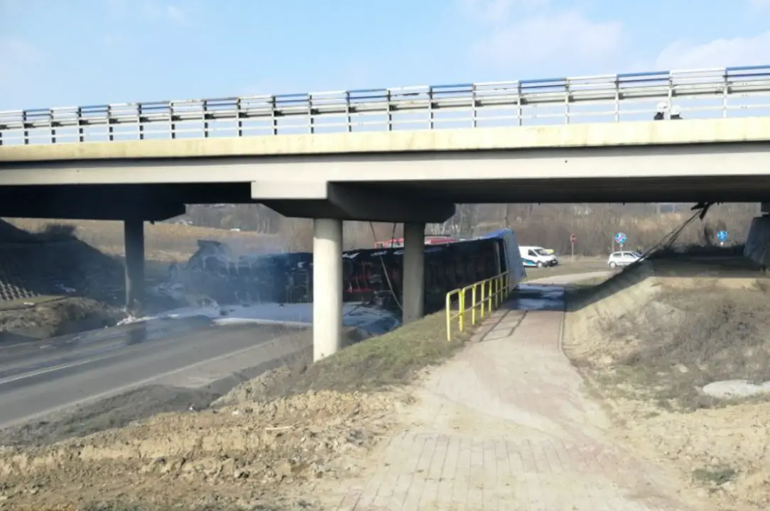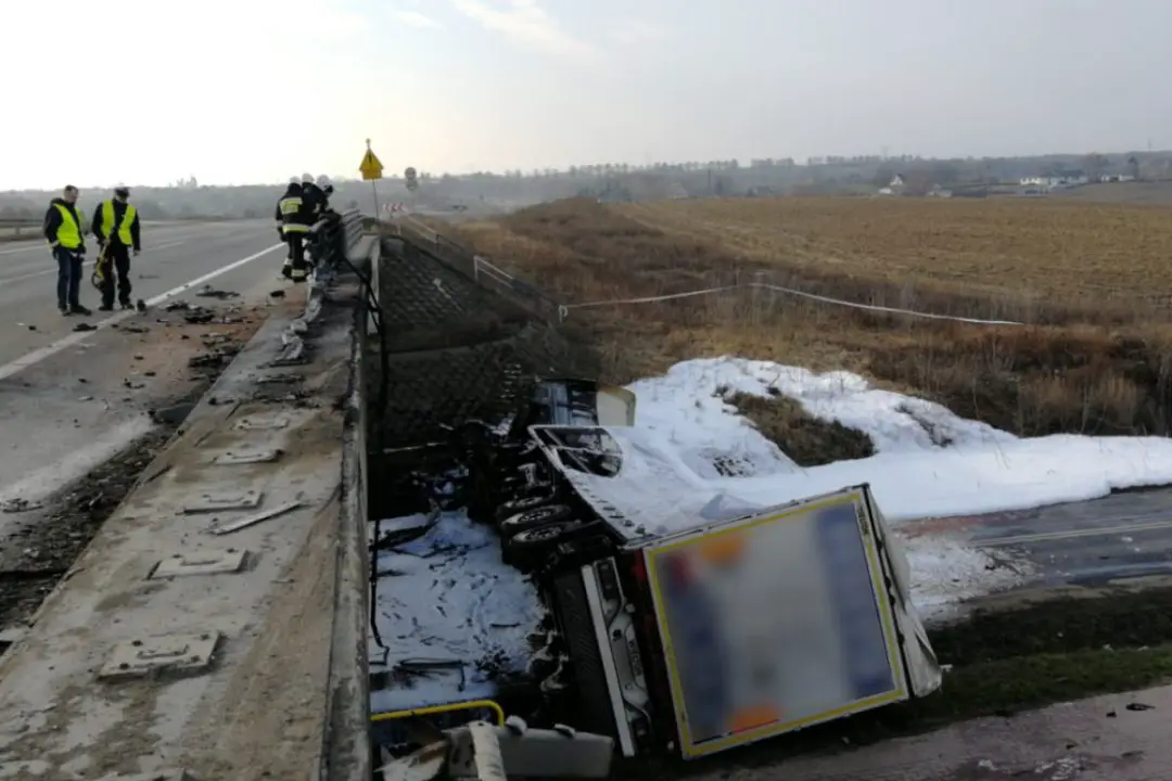 Ciężarówka, po zderzeniu, przechyliła się, przebiła barierki wiaduktu i spadła na przebiegającą pod nim drogę. Ciężarowy daf zapalił się. Kierowcy, przy pomocy świadka, na szczęście udało się opuścić pojazd, zanim całkowicie objął go ogień.
