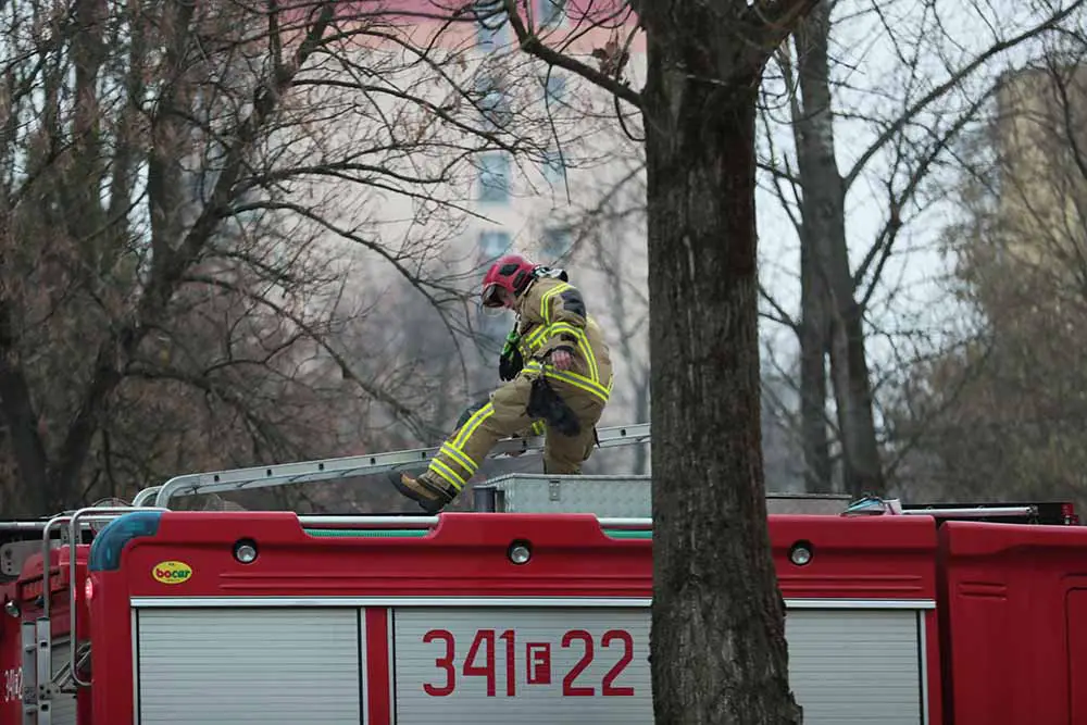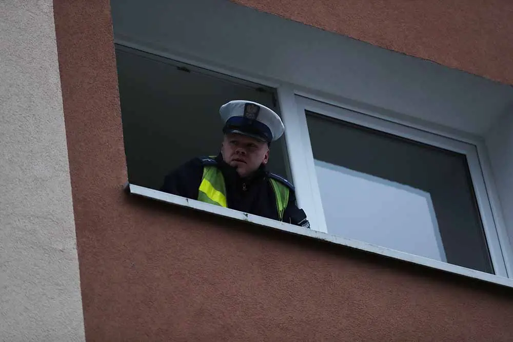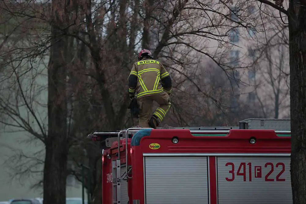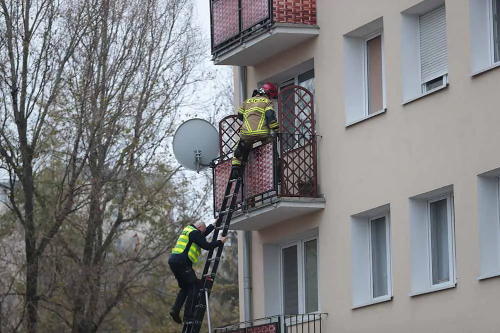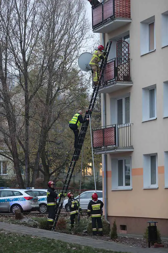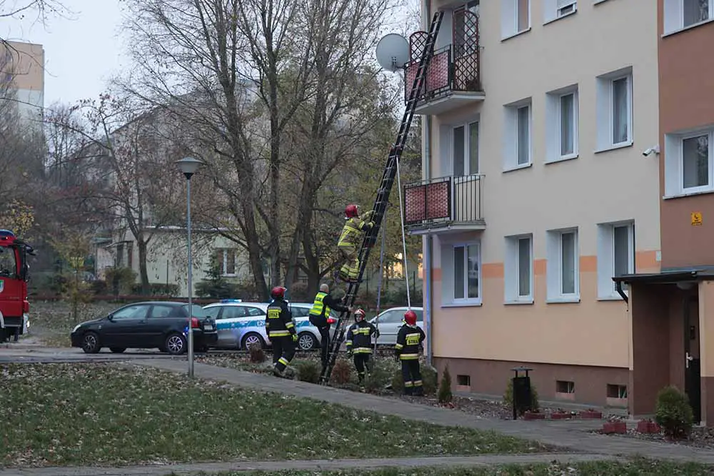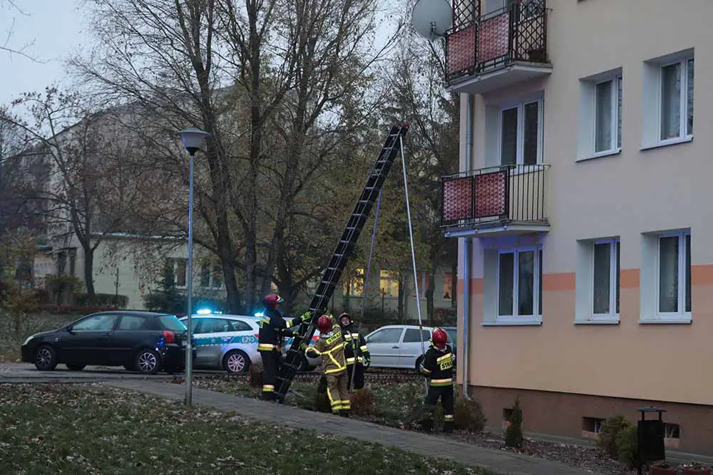 Na miejsce została wezwana straż pożarna. Strażacy po drabinie weszli razem z policjantami do mieszkania mężczyzny. Sprawdzili czy ktoś nie został w środku. W mieszkaniu był tylko duży pies.
