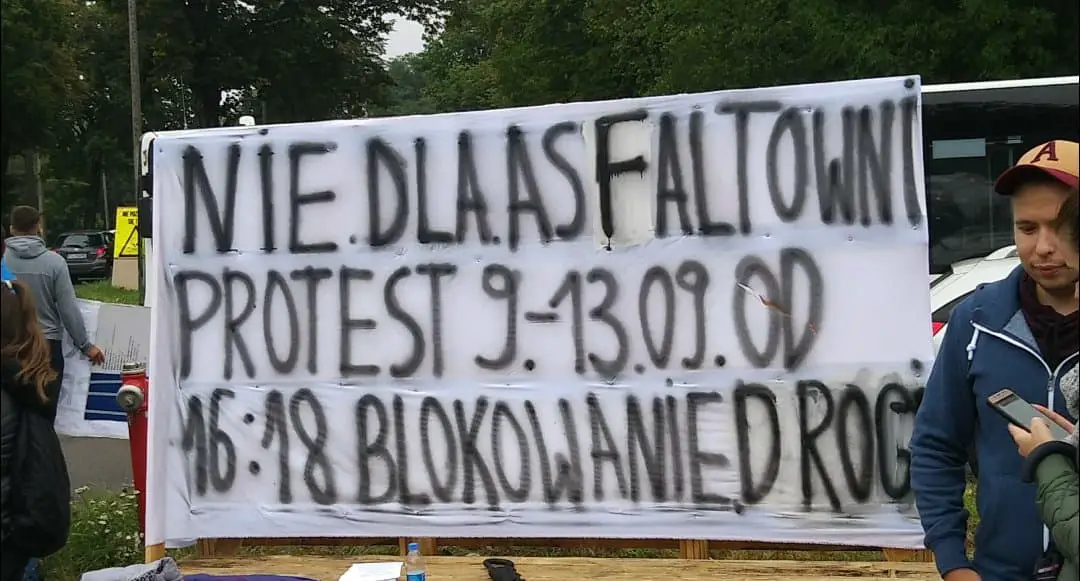 – Panie prezydencie zbieramy ci na mieszkanie w tym rejonie – krzyczy około 100 protestujących osób. Ludzie w proteście przeciwko budowie wytwórni mas bitumicznych zablokowali przejście dla pieszych przy pętli autobusowej na ul. Walczaka. Na miejscu są policjanci, którzy co kilka minut wstrzymują ruch samochodów.