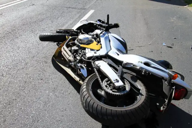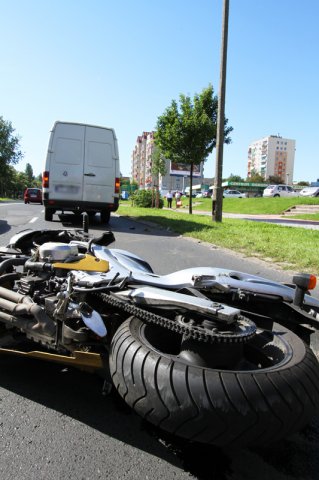 Motocyklista po upadku podniósł się o własnych siłach i sam ściągnął kask. Został zabrany do szpitala.