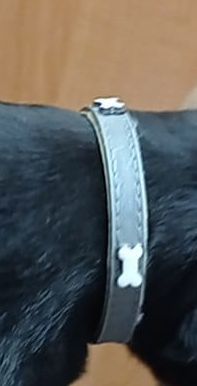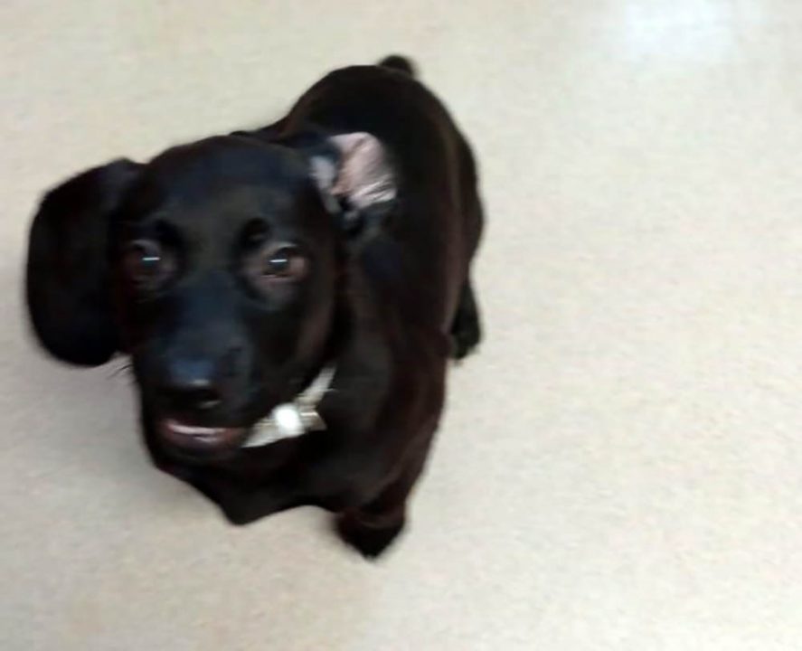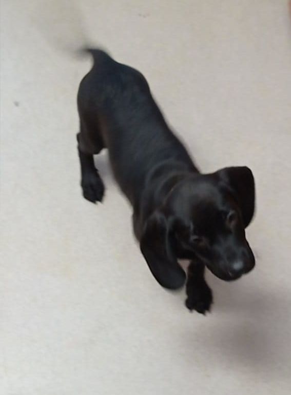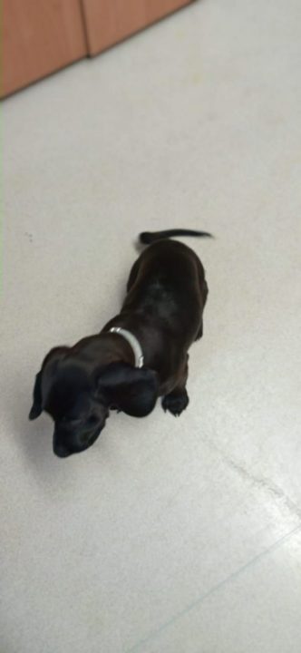 Czarny szczeniaczek przyszedł do budynku komendy miejskiej policji przy ul. Partyzantów 40. Ma charakterystyczną obróżkę.
