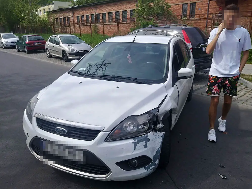 Kierujący skodą jechał ul. Olimpijską. Skręcał w ul. Gwiaździstą. Zrobił to jednak tak szerokim łukiem, że uderzył w stojącego tam forda. Po chwili zamiast wycofać kierujący pomylił biegi i pojechał do przodu drugi raz uderzając w forda.