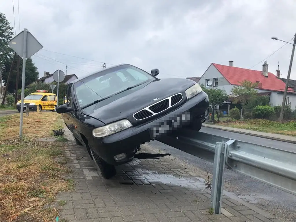 Do zdarzenia doszło w piątek, 12 lipca, w Płotach pod Zieloną Górą. Kierowca daewoo wpadł w poślizg, wypadł z drogi i samochód zawisł na barierce.
