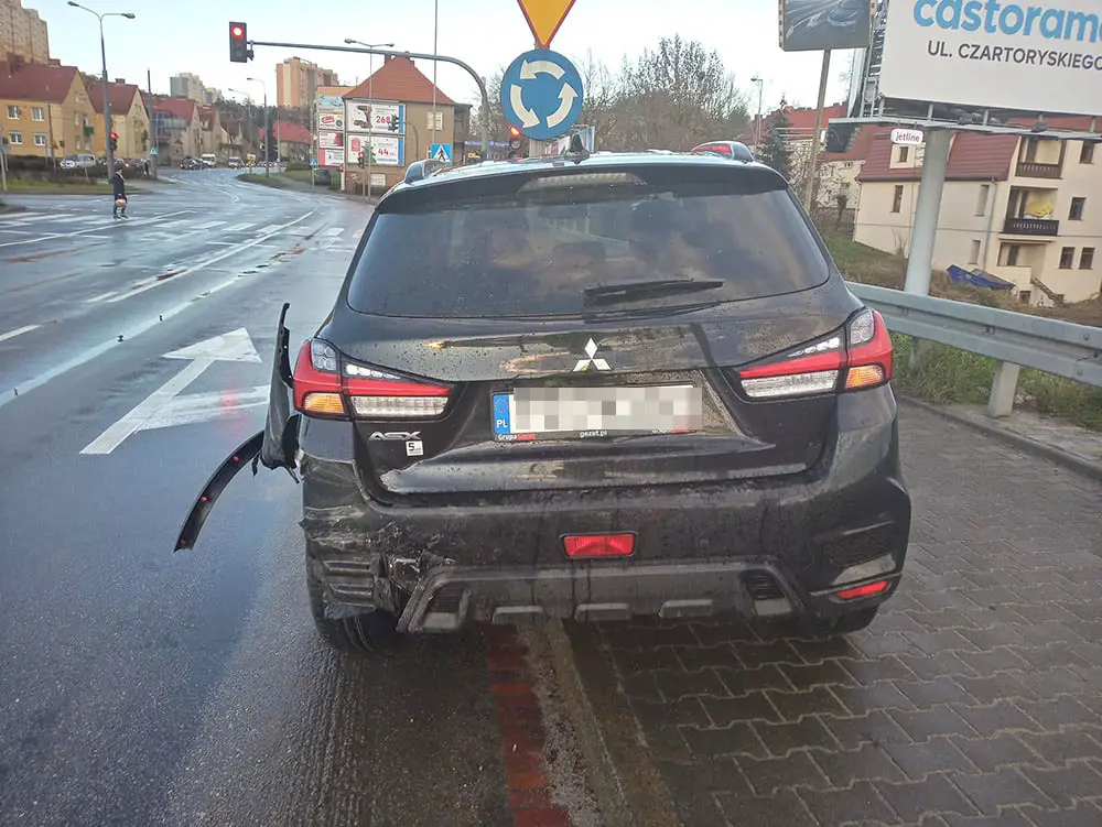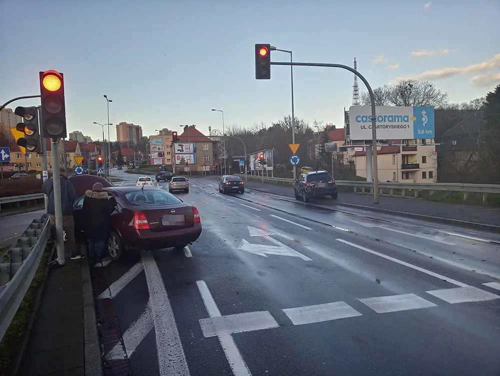 Kierująca mitsubishi zatrzymała się przed światłami. Nie zauważył tego kierujący nissanem i z dużą siłą uderzył w tył mitsubishi. Nissan ma bardzo mocno rozbity przód. Na szczęście nikomu nic się nie stało. Zdarzenie jest tylko kolizją.