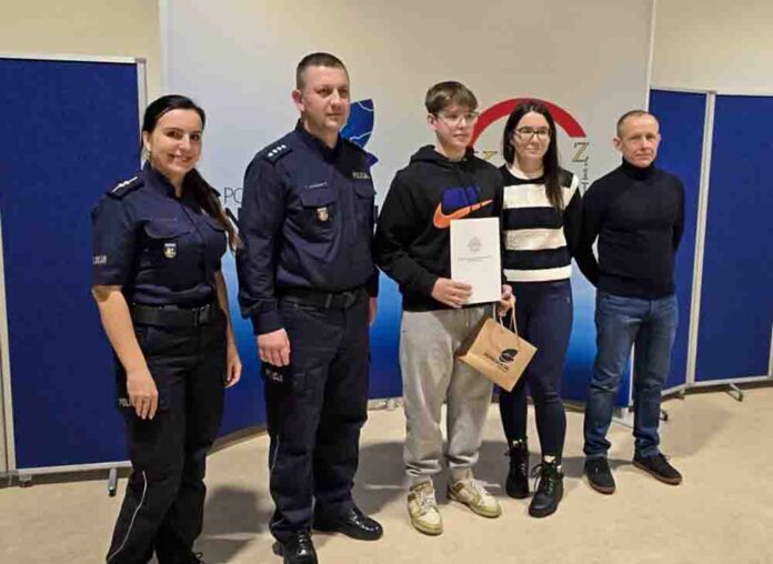 Szymon oraz jego rodzice odebrali podziękowania i upominki od komendanta policji, dyrektora CKZiU „Elektryk” oraz Arkadiusza Sidora z powiatu nowosolskiego. – Szymonie, gratulujemy przykładu, jaki dajesz rówieśnikom – mówi asp. Sęczkowska-Sobol.