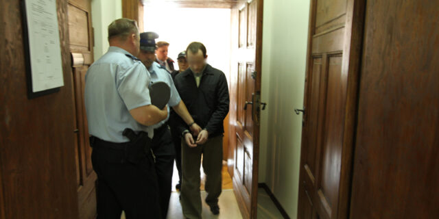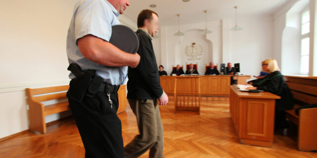Wczoraj oskarżony Waldemar K. wszedł na salę skuty kajdankami. Nie pije od zatrzymania, kiedy to ostatni raz miał kaca po denaturacie. Sąd przedłużył mu areszt. Grozi mu kara nawet dożywotniego więzienia.