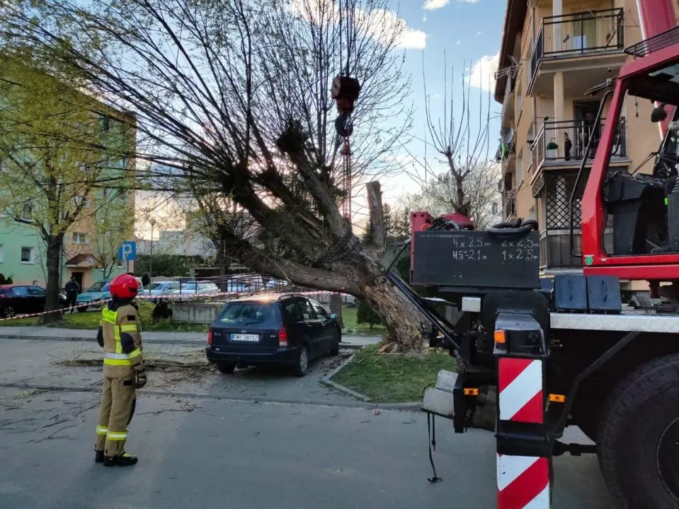 Na miejsce ściągnięto dźwigu ze straży pożarnej w Świebodzinie. Nim podniesiono drzewo. Obok stało inne drzewo z suchą koroną, które zostało ścięte podczas prowadzonych działań.