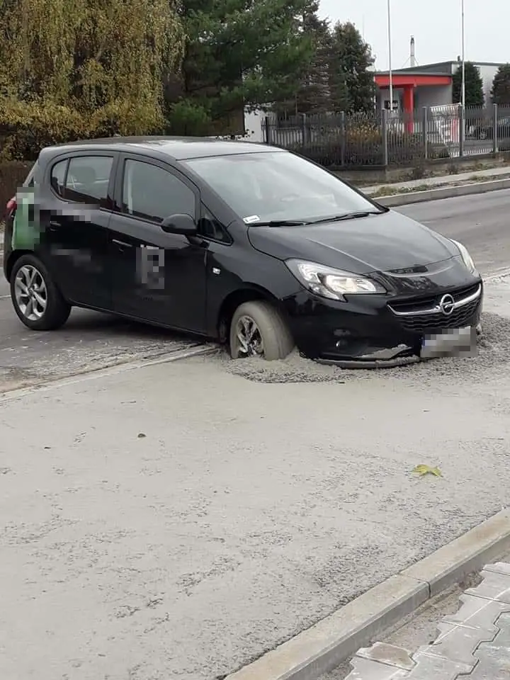 Do niecodziennego zdarzenia doszło we wtorek, 30 października, na ul. Lubuskiej w Deszcznie. Kierujący oplem wjechał w świeżo lany beton.