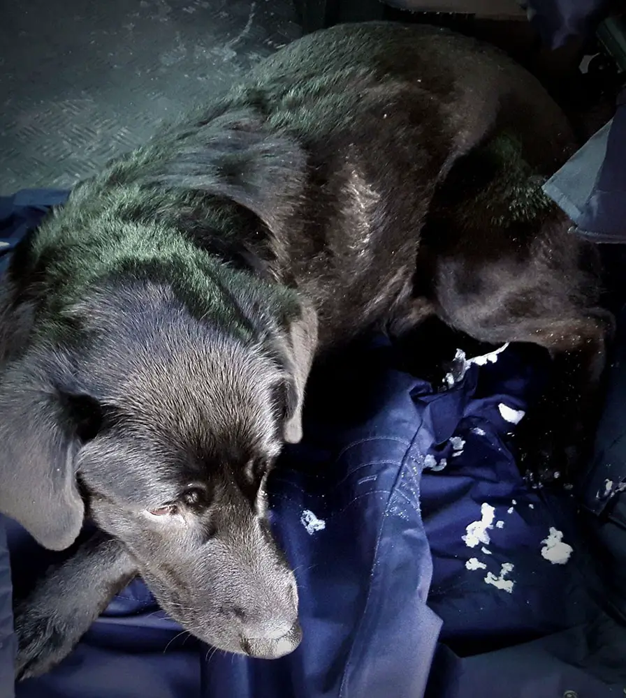 Żagańscy policjanci st. sierż. Paweł Potoczny i st. post. Sebastian Sokołowski w środę, 21 marca, zostali wysłani przez dyżurnego na pole koło Bożnowa. Miał tam leżeć pies. Osoba zgłaszająca powiedziała, że pies leży tam od dłuższego czasu. St. sierż. Potoczny i st. post. Sokołowski na miejscu zastali okropny widok. – Kiedy podeszli do czworonoga okazało się, że część jego ciała przymarzła do ziemi – opowiada sierż. Aleksandra Jaszczuk, rzeczniczka żagańskiej policji. Policjanci zdjęli swoje kurtki i ostrożnie otulili psa. Kiedy odmarzł przenieśli zwierzaka do radiowozu.
