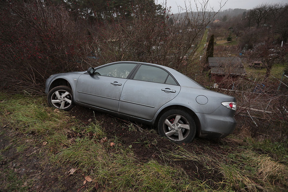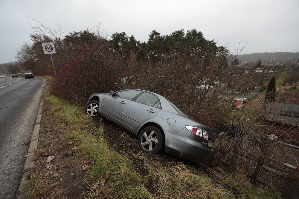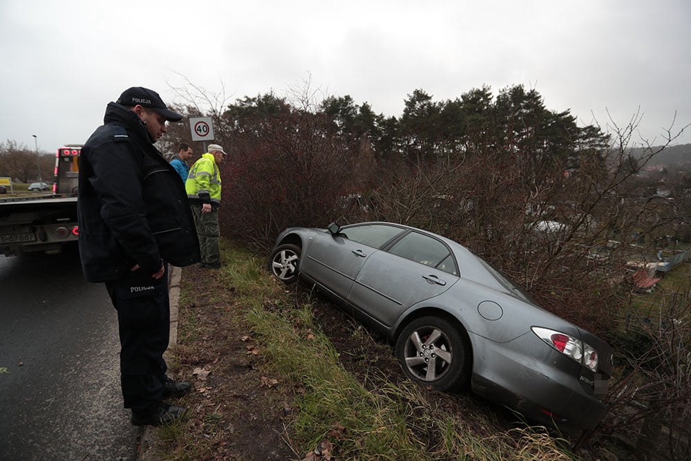 Kierujący mazdą na ul. Zachodniej wypadł z dogi. Samochód zatrzymał się na stromej skarpie na krzakach. Cudem nie stoczył się w dół na ogródki działkowe. Tam uderzyłby jeszcze w betonowe przęsła ogrodzenia.