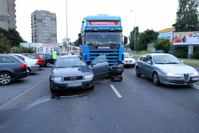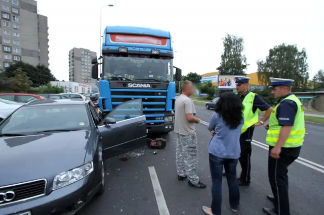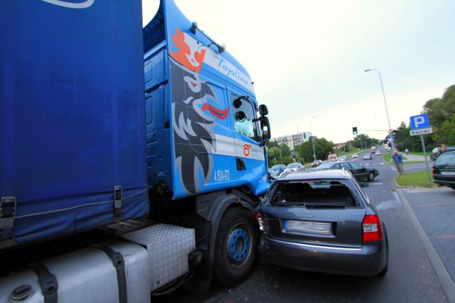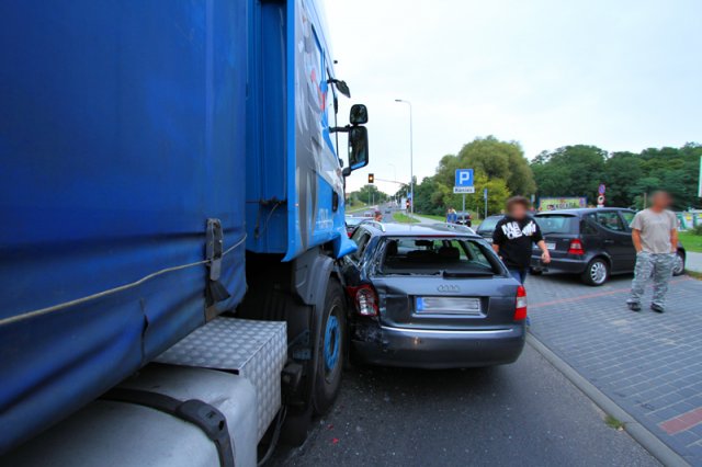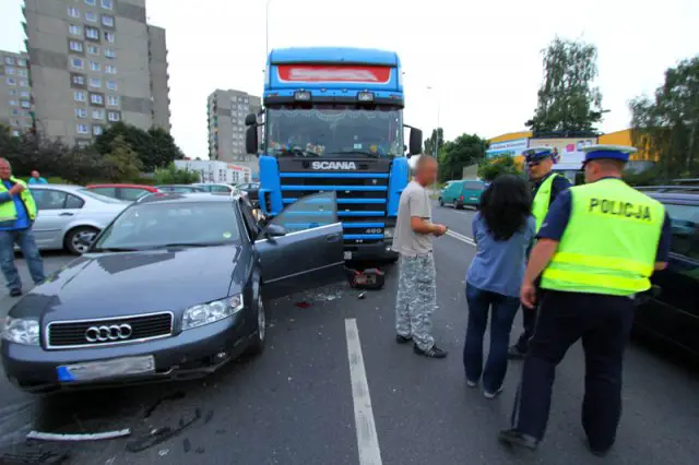 Najmocniej ciężarówka rozbiła audi na niemieckich numerach rejestracyjnych. Kobieta nie mogła wyjść z auta. Trzeba było siłą otwierać drzwi. Tir uderzył również w fiata punto nauki jazdy, citroena i volkswagena polo, na szczęście nikomu nic się nie stało.