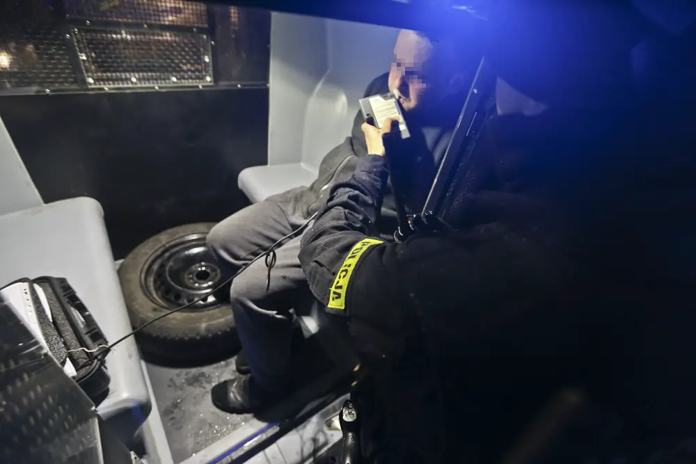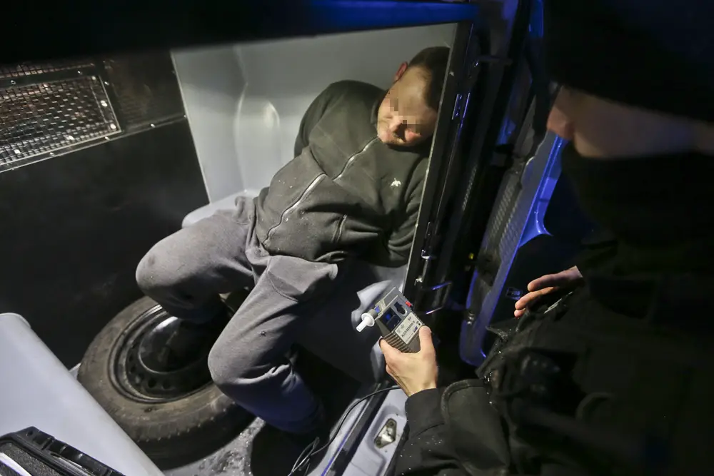 Zatrzymany kierowca citroena to Ukrainiec Jest kompletnie pijany. Wydmuchał prawie trzy promile alkoholu. Po chwili zasnął w radiowozie. Nie bardzo orientuje się nawet gdzie jest.