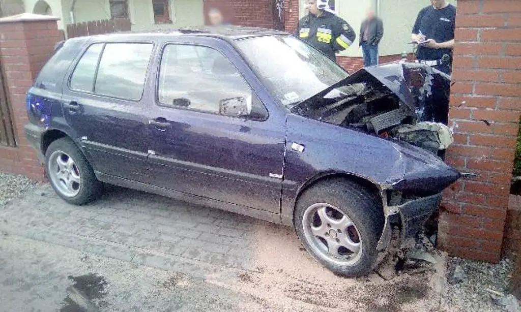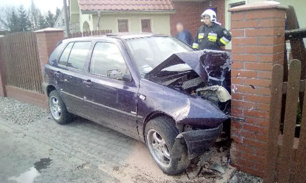 Jak on to zrobił? Golf uderzył przodem w murek i rozbił bramę. Prawdopodobnie po uderzeniu uniósł się tył auta i wtedy golf wpadł miedzy słupki klinując się.