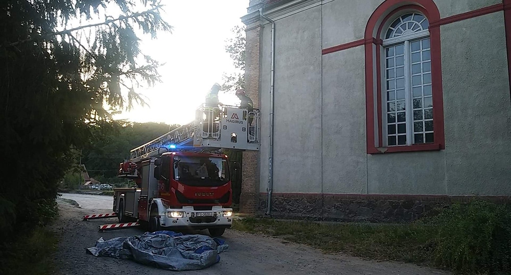 Do niecodziennego zdarzenia doszło w czwartek, 18 lipca, w Gorzowie na ul. Kostrzyńskiej. Wiatr zerwał plandekę z ciężarówki, która spadła na dach kościoła.
