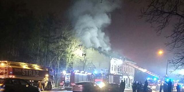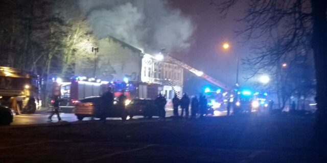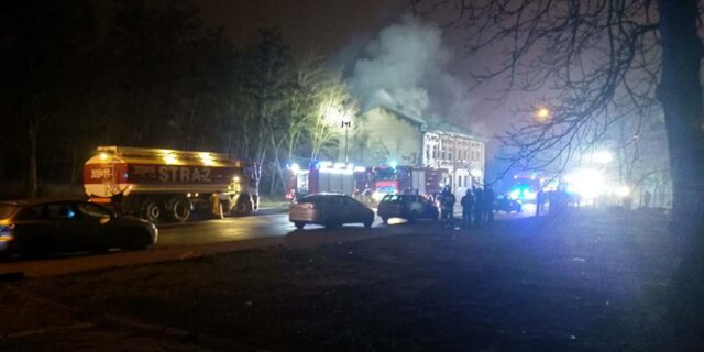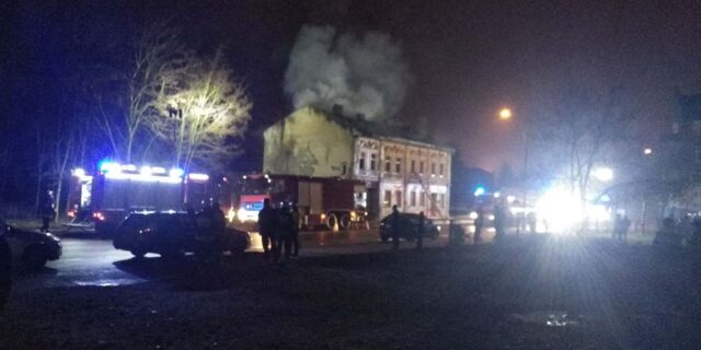 Pożarem objęta jest niezamieszkana kamienica. Około godz. 21.40 na miejscu akcji było już sześć jednostek straży pożarnej. Płomienie wychodziły na dach. Strażacy leją wodę między innymi z podnośnika.