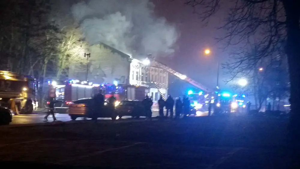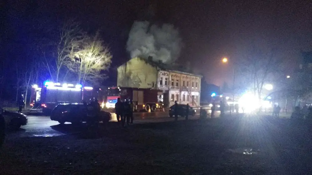 Pożarem objęta jest niezamieszkana kamienica. Około godz. 21.40 na miejscu akcji było już sześć jednostek straży pożarnej. Płomienie wychodziły na dach. Strażacy leją wodę między innymi z podnośnika.