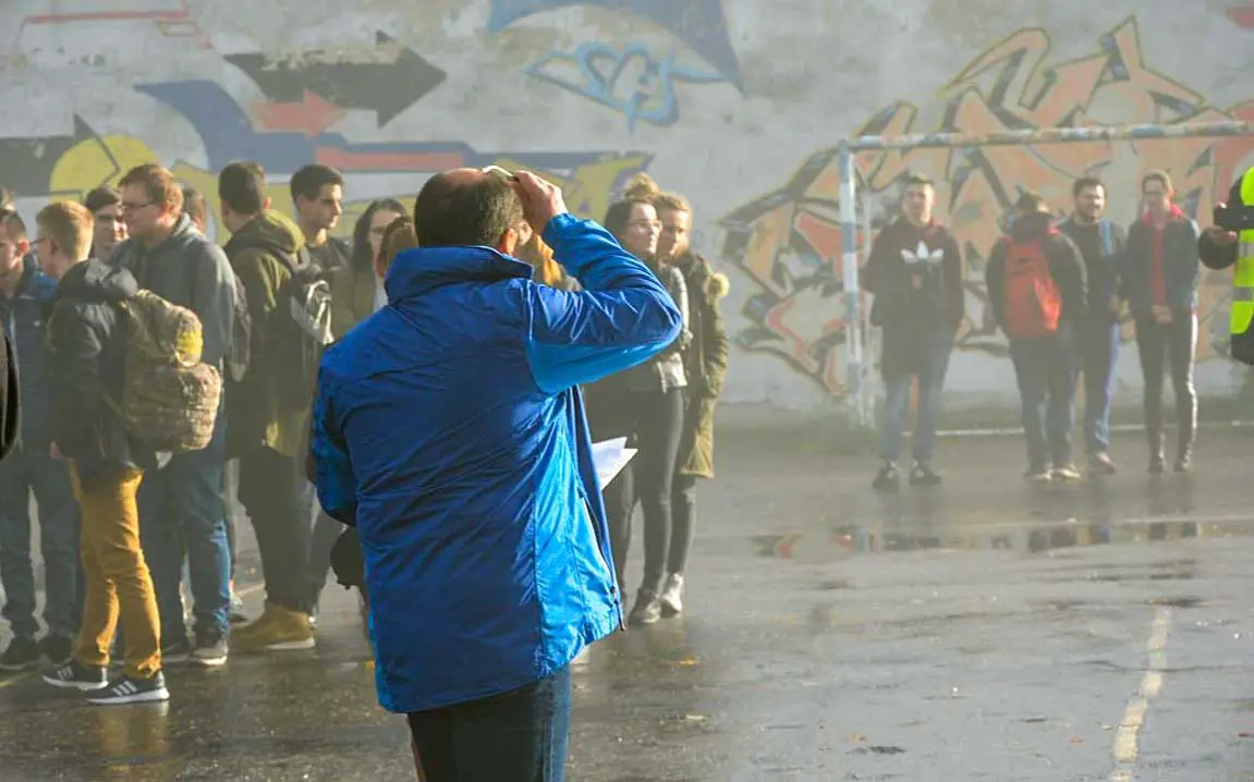 Dyrektor szkoły natychmiast o zdarzeniu powiadomił strażaków oraz policję, a także zarządził ewakuację szkoły. Dym rozprzestrzeniał się wszędzie, utrudniając widoczność. Jednak już po kilku minutach uczniowie drogami ewakuacyjnymi wyszli na miejsce zbiórki, a nauczyciele zdali meldunek dyrektorowi szkoły o ilości ewakuowanych uczniów.