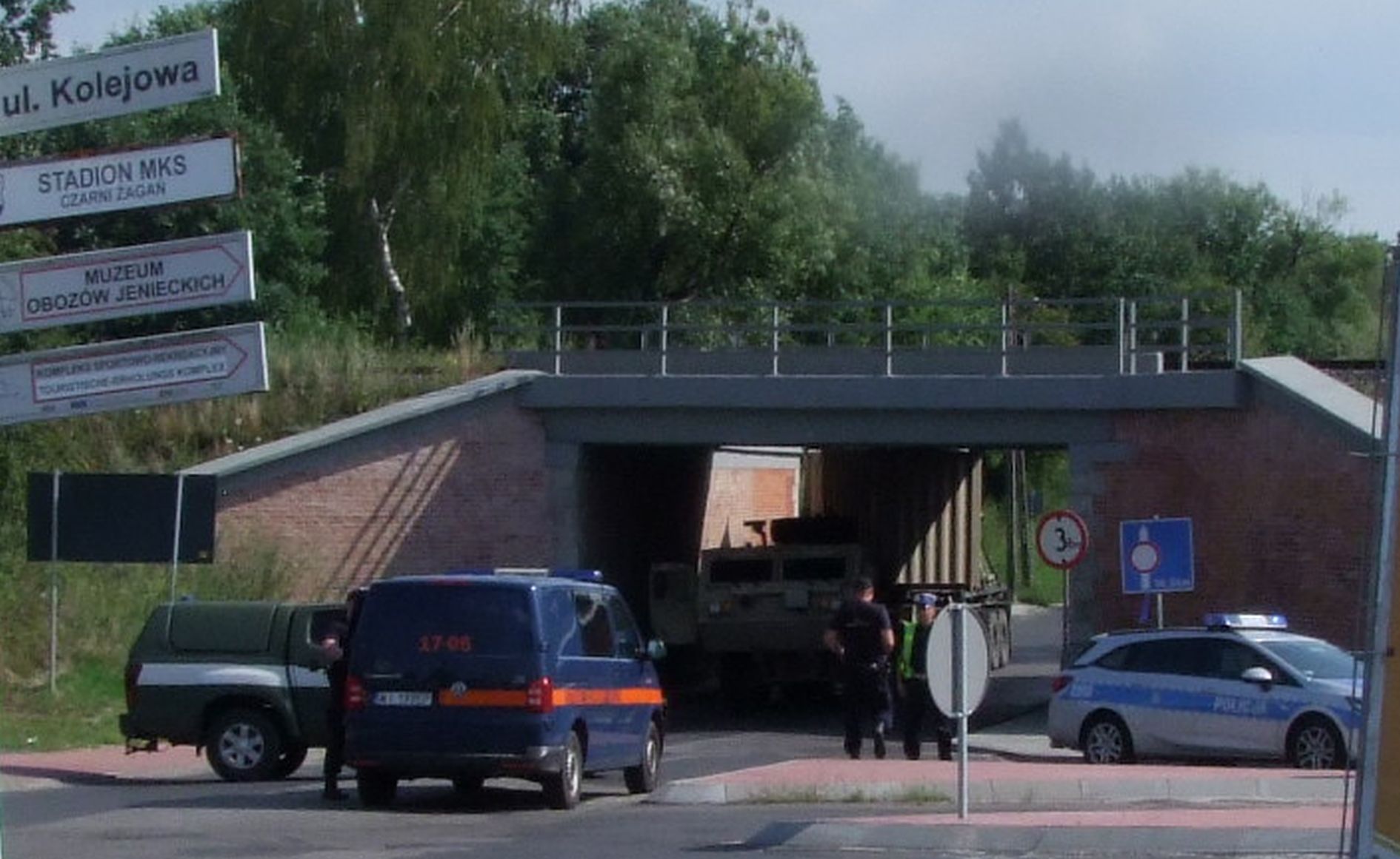 Do zdarzenia doszło w poniedziałek, 23 lipca. Stacjonujący w obozach pod Żaganiem amerykańscy żołnierze utknęli pod wiaduktem blokując drogę na ul. Żelaznej w kierunku Świętoszowa.