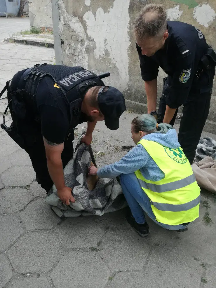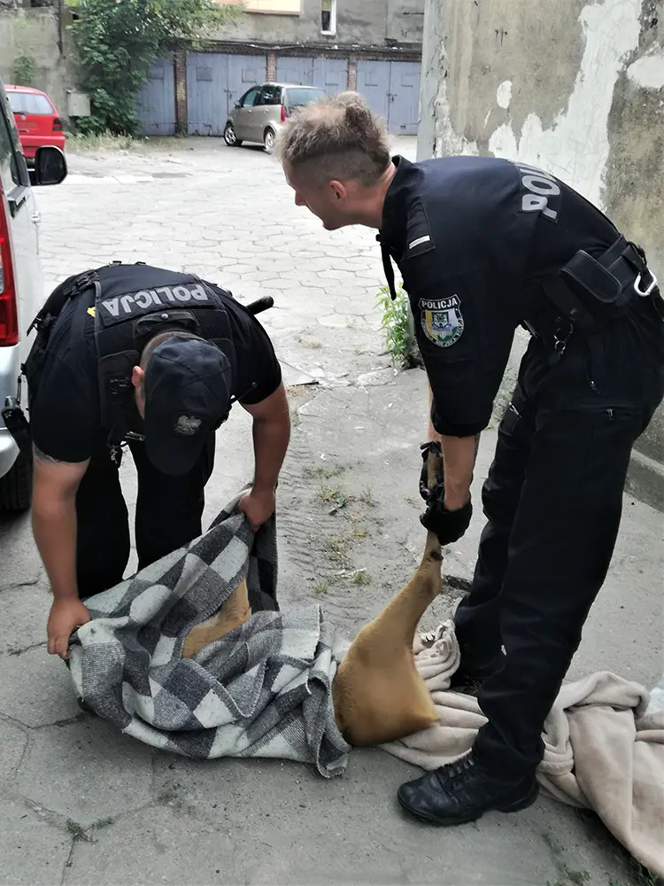 Jego kolega z patrolu st. post. Maciej Wójcik odważnie podszedł do nietypowego zadania. Okazało się jednak, że potrzebne jest wsparcie. Trzeba było młodego i wystraszonego rogacza zagonić w miejsce, z którego koziołek nie mógłby uciec. Dyżurny na miejsce wysłał kolejny patrol w składzie sierż. Krzysztof Diller i st. sierż. Krzysztof Zapotoczny. Na miejsce przyjechała również powiadomiona telefonicznie Sylwia Dobek z zielonogórskiego Stowarzyszenia „Inicjatywa dla Zwierząt”. Rogacz został umiejętnie wpędzony w podwórze kamienicy, tam policjanci odcięli mu drogę ucieczki i z pomocą koca zarzuconego na koziołka złapali go.