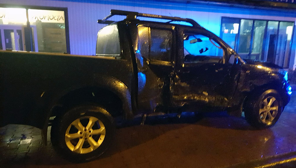Policja skuła kajdankami kierowcę nissana. Został zabrany do radiowozu. Powiedział, że… jest bezdomny. Kierowca nissana najprawdopodobniej jest pijany.