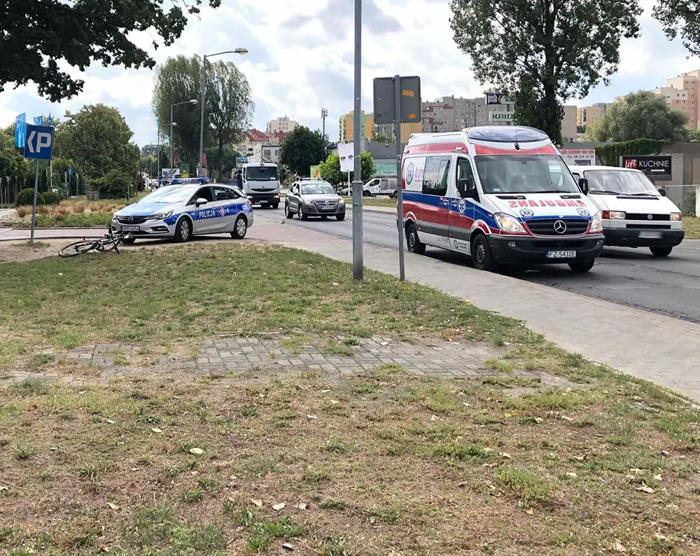 Potrącony przez samochód rowerzysta został zabrany do karetki przez medyków. Mężczyzna był przytomny. Na miejscu są policjanci z zielonogórskiej drogówki. Ustalają przyczynę oraz przebieg zdarzenia. Nie ma utrudnień w ruchu.