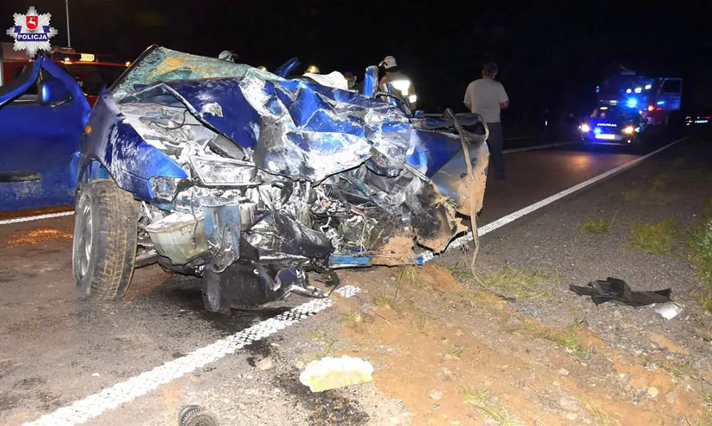 Łukowscy policjanci (woj. lubelskie) wyjaśniają okoliczności wypadku, do którego doszło w środę, 29 sierpnia, wieczorem na drodze wojewódzkiej nr 808 w Siedliskach. Z wstępnych ustaleń policji wynika, że kierujący nissanem 19-latek z gminy Wojcieszków zderzył się z jadącą z przeciwka ciężarówką volvo z naczepą pełną jabłek. Kierujący nissanem 19-latek tuż przed zderzeniem z ciężarówką chciał uniknąć zderzenia z jadącym z przeciwka samochodem marki dodge, którego kierujący wyprzedzał inny samochód ciężarowy.
