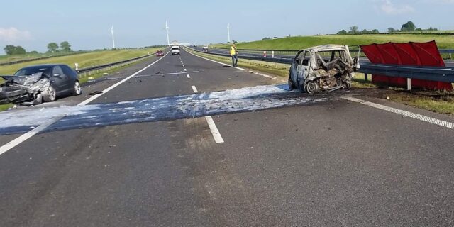 Do wypadku doszło na prostym odcinku drogi. Z niewyjaśnionych jeszcze przyczyn kierujący matizem zjechał na prawy pas i tam zatrzymał się. Wtedy w matiza uderzyło audi. Zaraz po zderzeniu matiz stanął w płomieniach.
