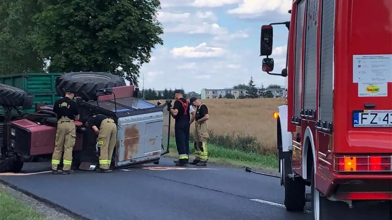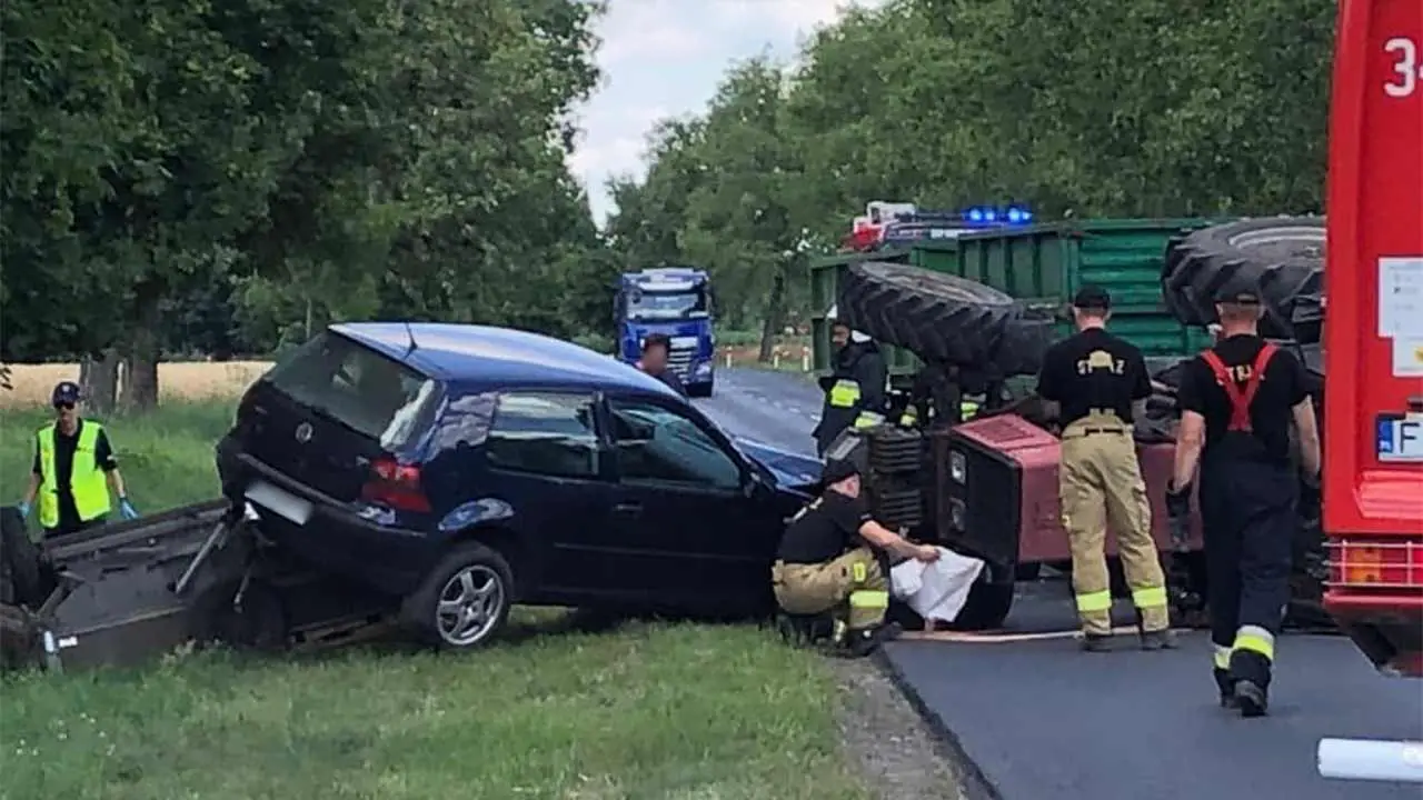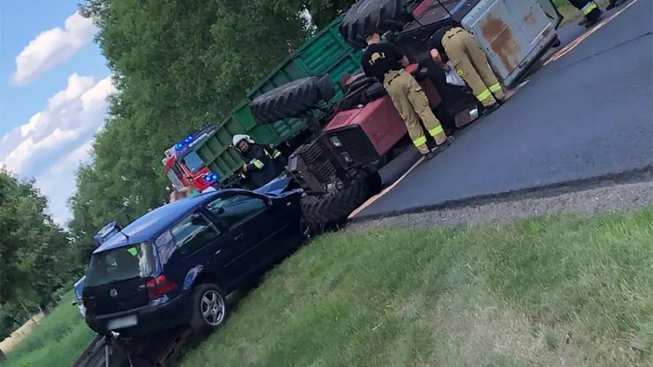 Z niewyjaśnionych jeszcze przyczyn doszło do czołowego zderzenia volkswagena golfa z traktorem. Po zderzeniu traktor przewrócił się na bok, a osobówka wypadła na trawiaste pobocze.