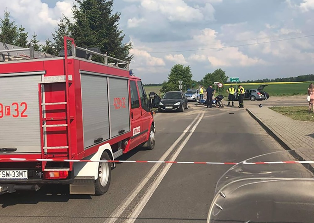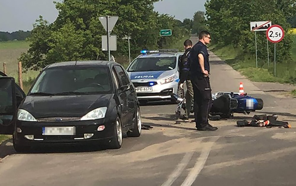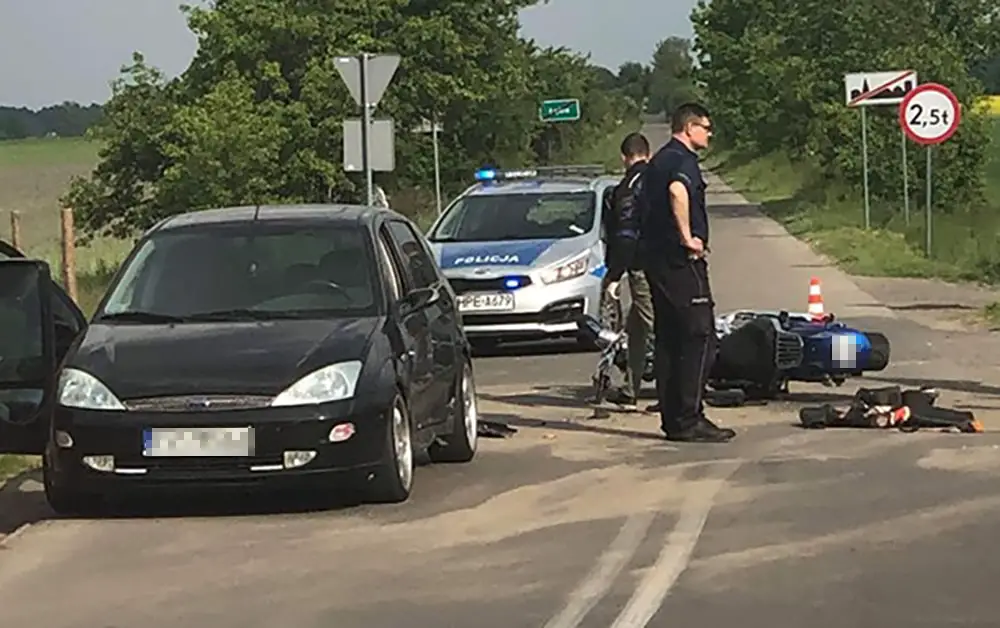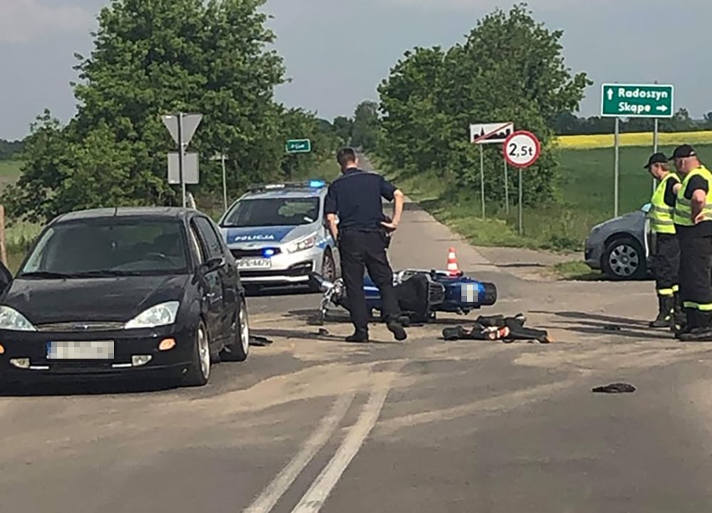 Do wypadku doszło w niedzielę, 19 maja, w miejscowości Łąkie przy rozjeździe dróg do Skąpego i Radoszyna. Motocyklista zderzył się z fordem. Ciężko ranny trafił do szpitala. Na miejscu jest świebodzińska drogówka.