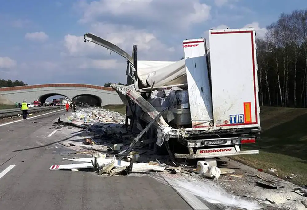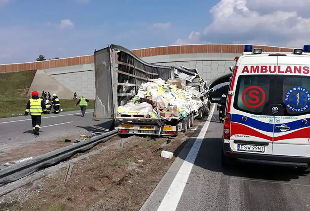 Po uderzeniu kierowca stracił panowanie nad ciężarówką. Wpadł w poślizg i uderzył w barierki rozbijając je. Ciężarówka wyleciała na przeciwległy pas ruchu blokując go. W dodatku na długości około 200 m na autostradę wysypały się wiezione przez ciężarówkę materiały budowlane.
