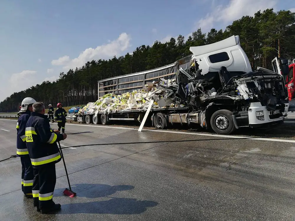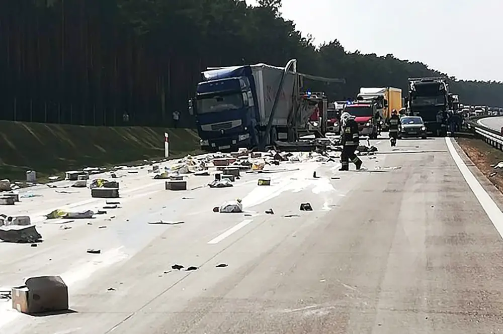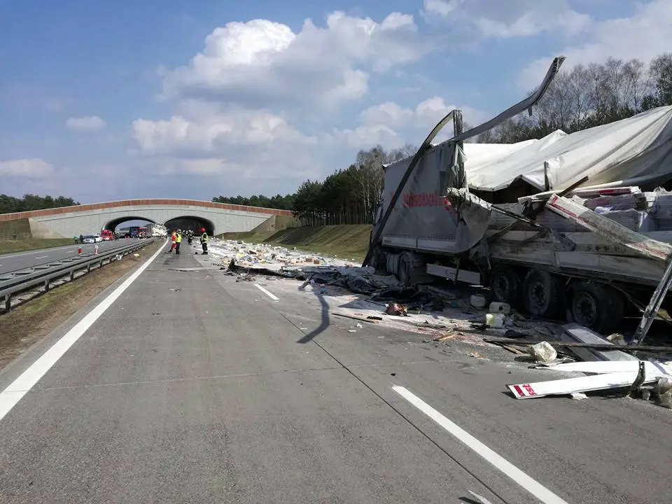 Do wypadku doszło w sobotę, 14 kwietnia, na autostradzie A2 na wysokości Chociszewa (pow. międzyrzecki). Ciężarówka uderzyła w bok stojącej ciężarówki i rozbiła barierki. Na drodze na długości około 200 m leżą materiały budowlane. Autostrada jest zablokowana w obu kierunkach.