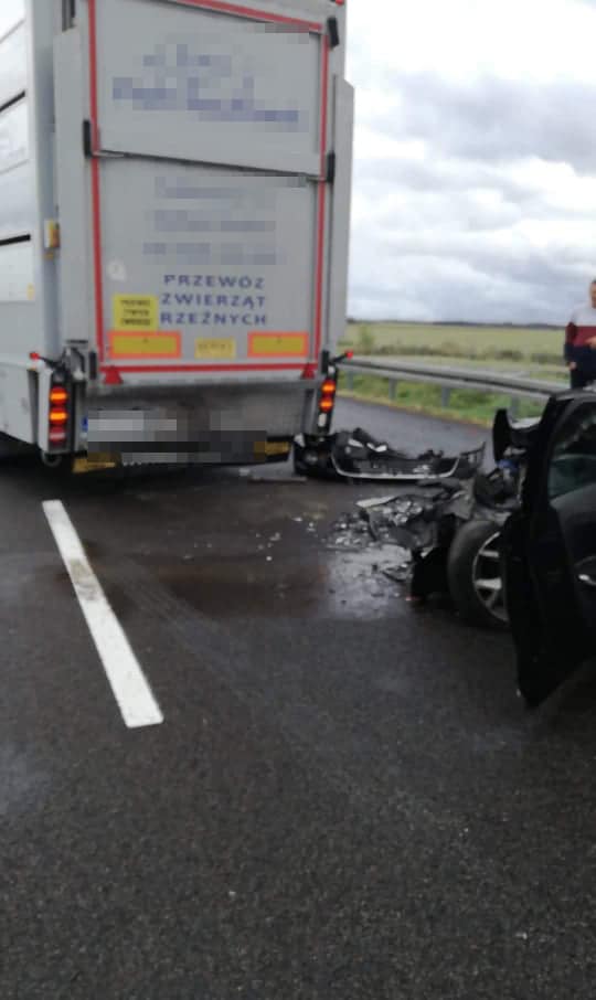 Kierowca citroena z niewyjaśnionych jeszcze przyczyn uderzył w tył ciężarówki przewożącej zwierzęta. Uderzenie było bardzo mocne. Przód citroena został kompletnie rozbity. W aucie wystrzeliły poduszki powietrzne. Na miejsce wypadku przyjechały służby ratunkowe. Ranny kierowca citroena został przewieziony do szpitala.