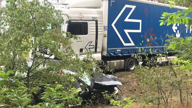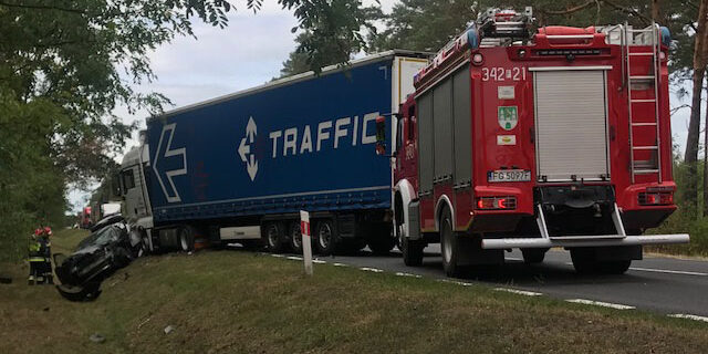 Audi jechało w kierunku Zielonej Góry. Nagle kierowca zjechał na przeciwległy pas ruchu i czołowo zderzył się z jadącą z naprzeciwka ciężarówką. Kierowca ciężarówki robił co mógł, żeby uniknąć zderzenia, ale nie miał na to szans. Ciężarówka po zderzeniu zepchnęła audi z drogi.